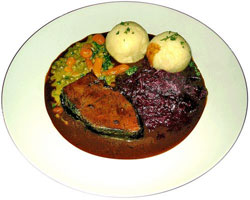 Rheinischer Sauerbraten Zutaten für 4 Personen:½ Liter Wein, rot, trocken 125 ml Essig (Rotweinessig) 1 Bund Suppengrün 2 Zwiebel(n) einige Pfeffer - Körner 2 Lorbeerblätter 4 Wacholderbeeren 2 Piment - Körner 2 kg Rindfleisch, magerer Rinderschmorbraten (ursprünglich mit Pferdeschmorbraten) 30 g Schweineschmalz 100 g Pumpernickel 1 handvoll Rosinen 125 ml Gemüsebrühe Salz Zubereitung:Rotwein und Essig mischen. Das Suppengrün putzen, waschen und kleinschneiden. Die Zwiebeln pellen und halbieren. Das Gemüse zusammen mit den Pfefferkörnern, Lorbeerblättern, dem Wacholder und Pimentkörnern in den Rotweinessig geben. Den Schmorbraten in die Marinade legen und vollständig bedeckt mindestens 2 Tage an einem Kühlen Ort ziehen lassen.Tipp: Am besten das Fleisch mit der Marinade in eine große Plastiktüte füllen, die Luft herausdrücken und verschweißen!Am Tag der Zubereitung das Fleisch aus der Marinade nehmen, trockentupfen und rundherum mit Salz einreiben. Anschließend das Fleisch in dem Schmalz rundherum kräftig anbraten. Mit einem kleinen Teil der Marinade ablöschen. Um die Marinade etwas abzuschwächen (die spätere Soße wird dadurch milder) den Rest mit der Gemüsebrühe zu gleichen Teilen mischen. Diese Mischung nach und nach in den Geschlossenen Topf gießen und den Inhalt für 45 Minuten schmoren lassen. Das Fleisch wenden, den Pumpernickel zerkleinert hinzufügen und alles zusammen für weitere 30 Minuten bei milder Hitze schmoren. Das Fleisch immer wieder mit dem Sud übergießen.Abschließend das Fleisch herausnehmen und warm halten. Die Soße durch ein Sieb streichen (passieren). Rosinen hinzufügen und kurz aufkochen lassen. Das Fleisch in Scheiben schneiden und auf einem Teller anrichten. Die Soße getrennt dazureichen.Dazu passen Semmel- oder Kartoffelknödel, Apfelkompott und, ganz wichtig, frisch gezapftes Kölsch.Guten Appetit
